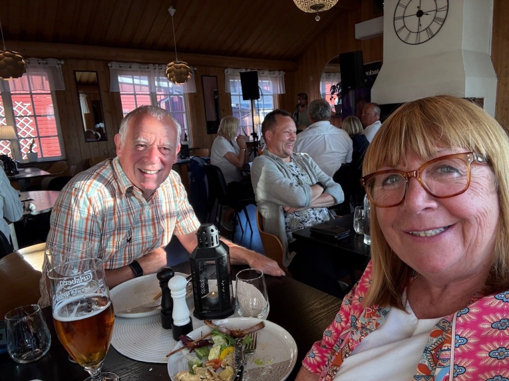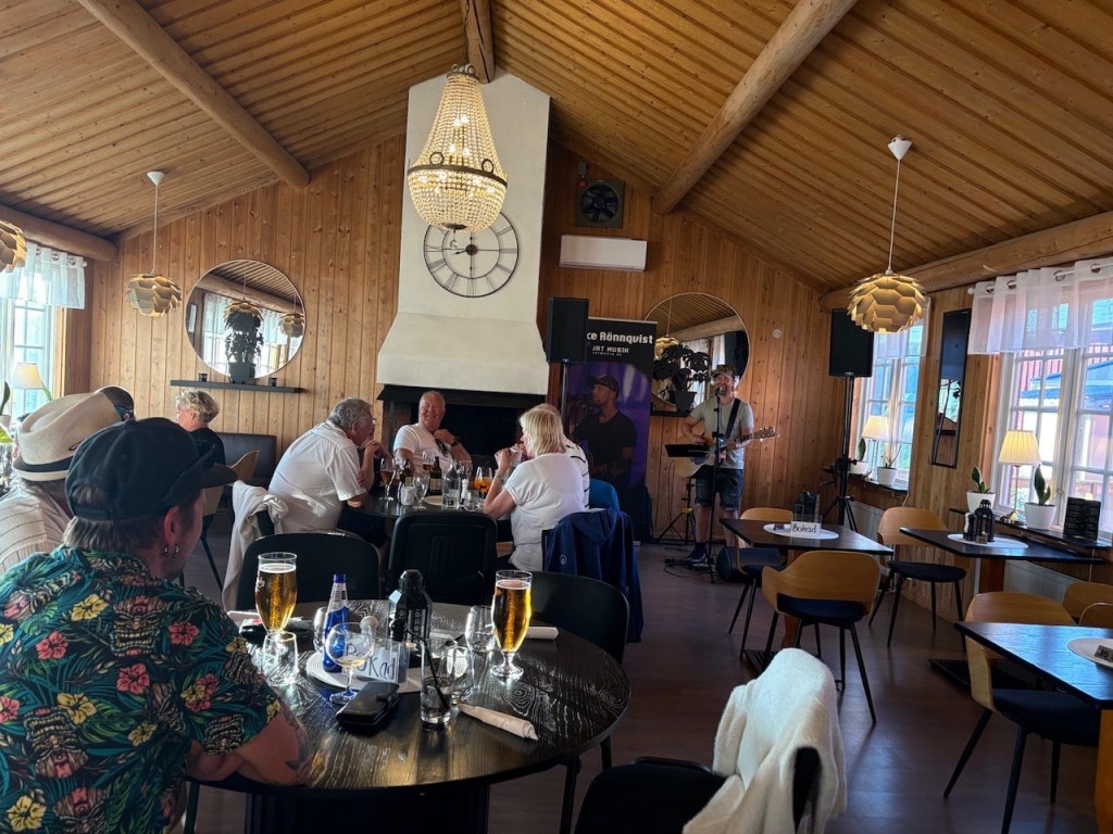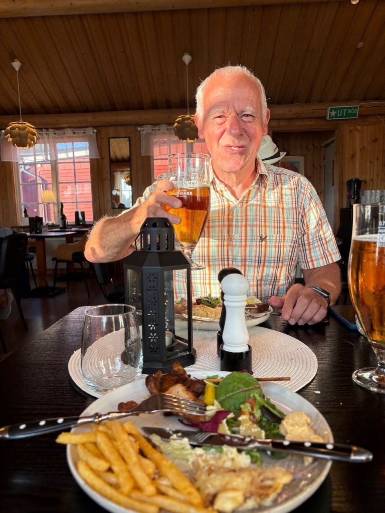 There’s a restaurant onsite and a turn on, so we book a table for 8pm. T orders large beers and they come in 750ml glasses! That’s one and a half pints at 130 Swedish Kronor so £9.99 each! Luckily they taste good.