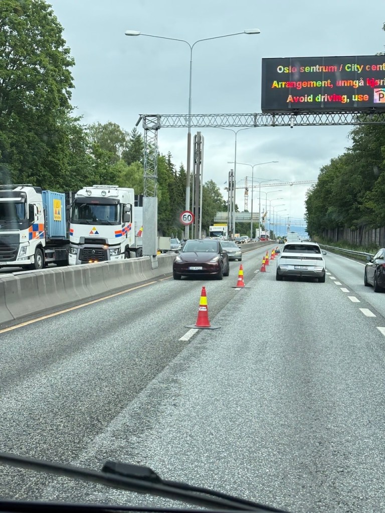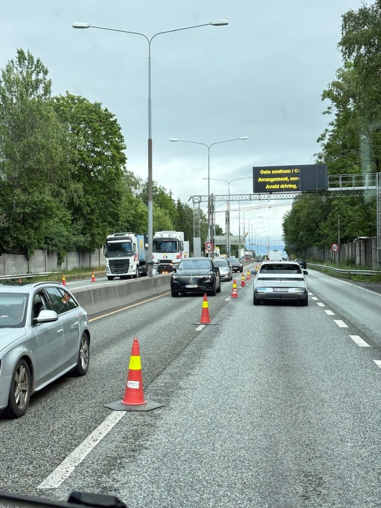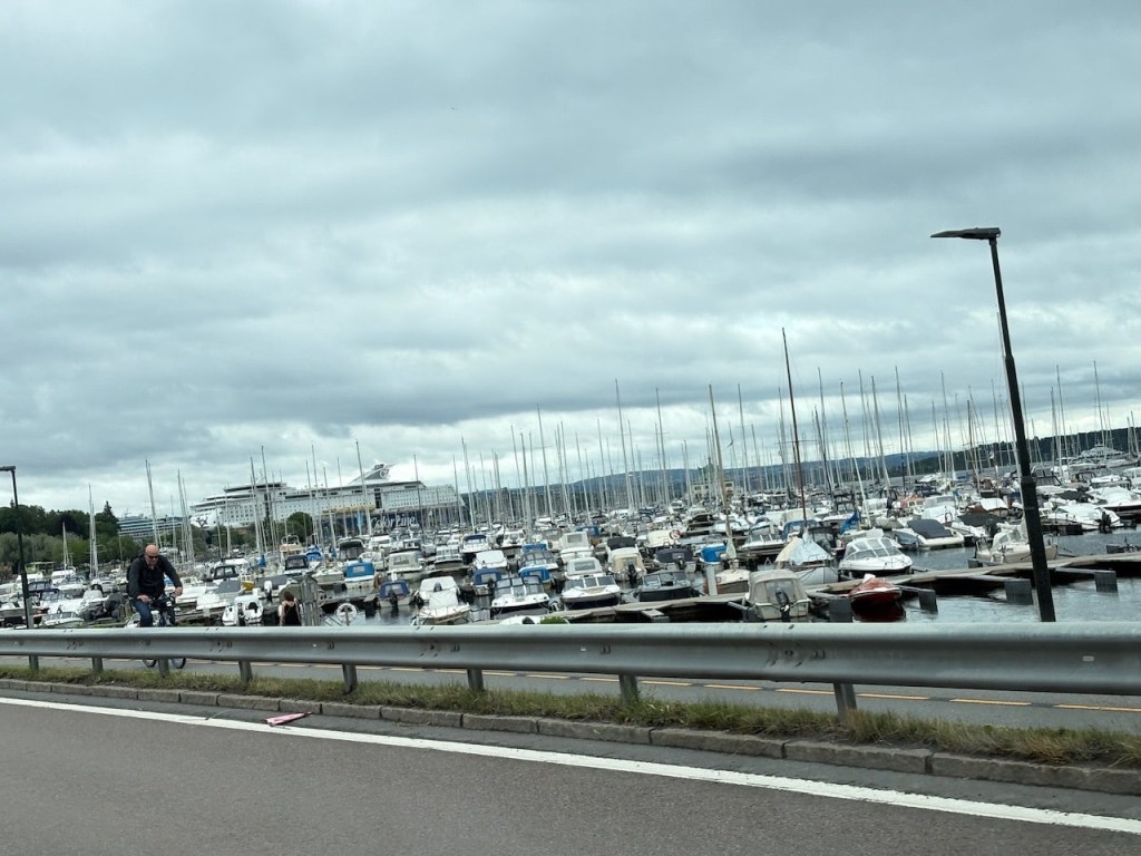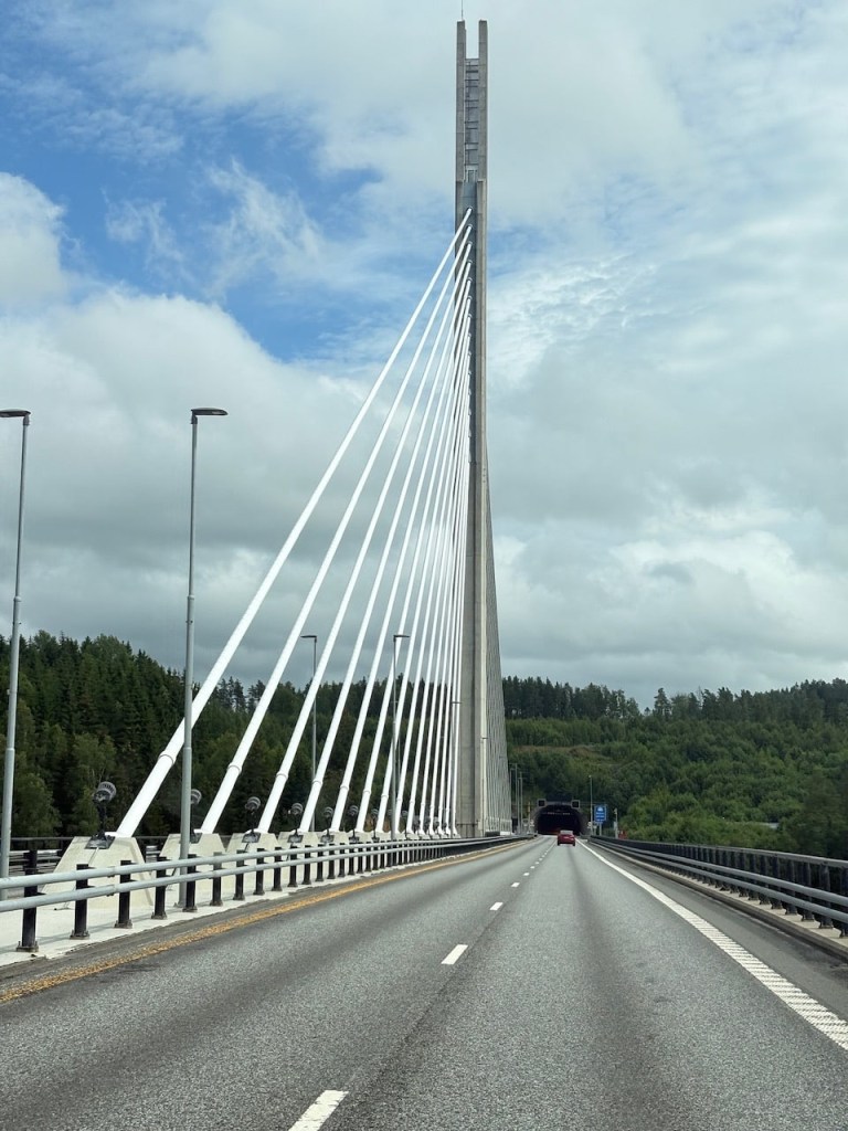It’s a boring drive, made longer as we get stuck in traffic outside Oslo due to roadworks and very long traffic delays. Getting around Oslo through a complicated tunnel and road system is a bit hair raising but we manage. We listen to a few trivia quizzes on Spotify to keep us entertained.