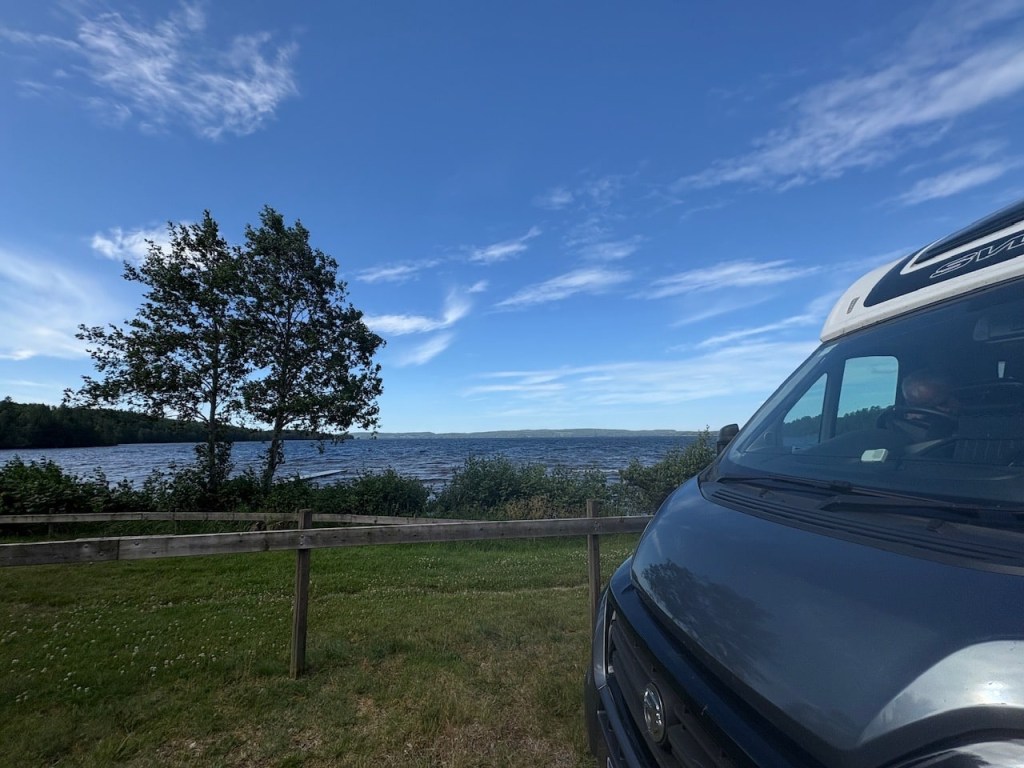 Luckily there’s a not quite so picturesque park up five minutes away where we bag a shady spot. It’s a huge gravel lot backing onto a lovely green park which then backs up to the lake.