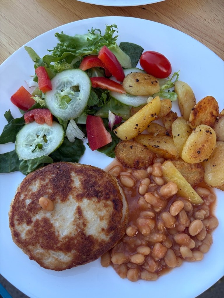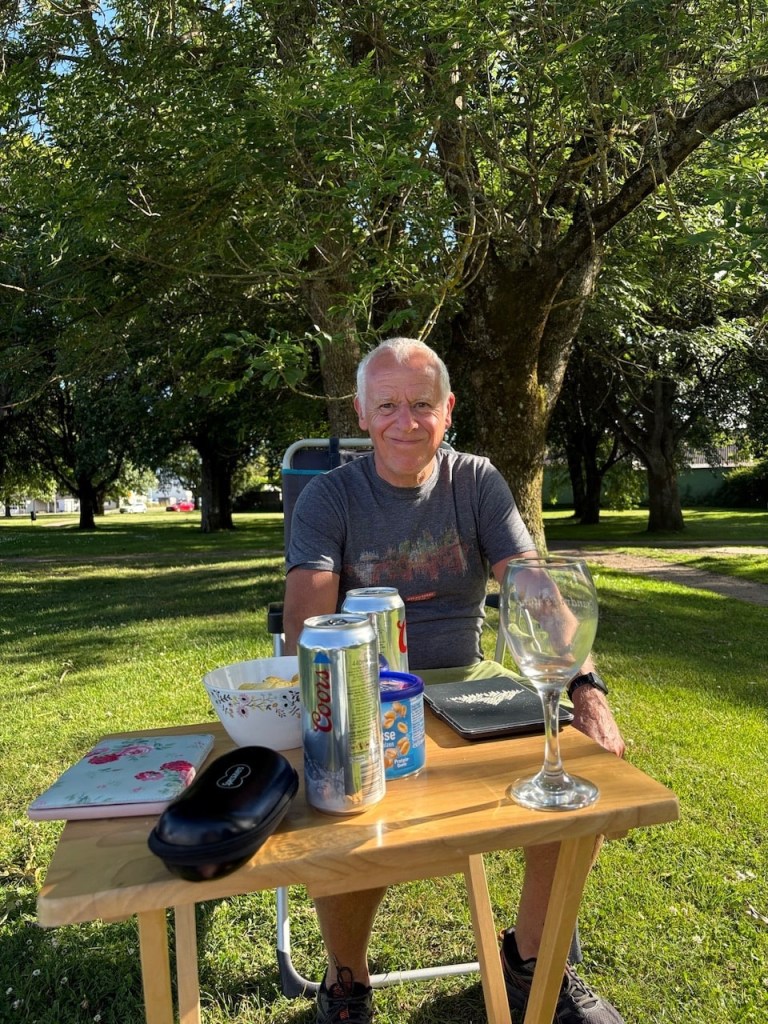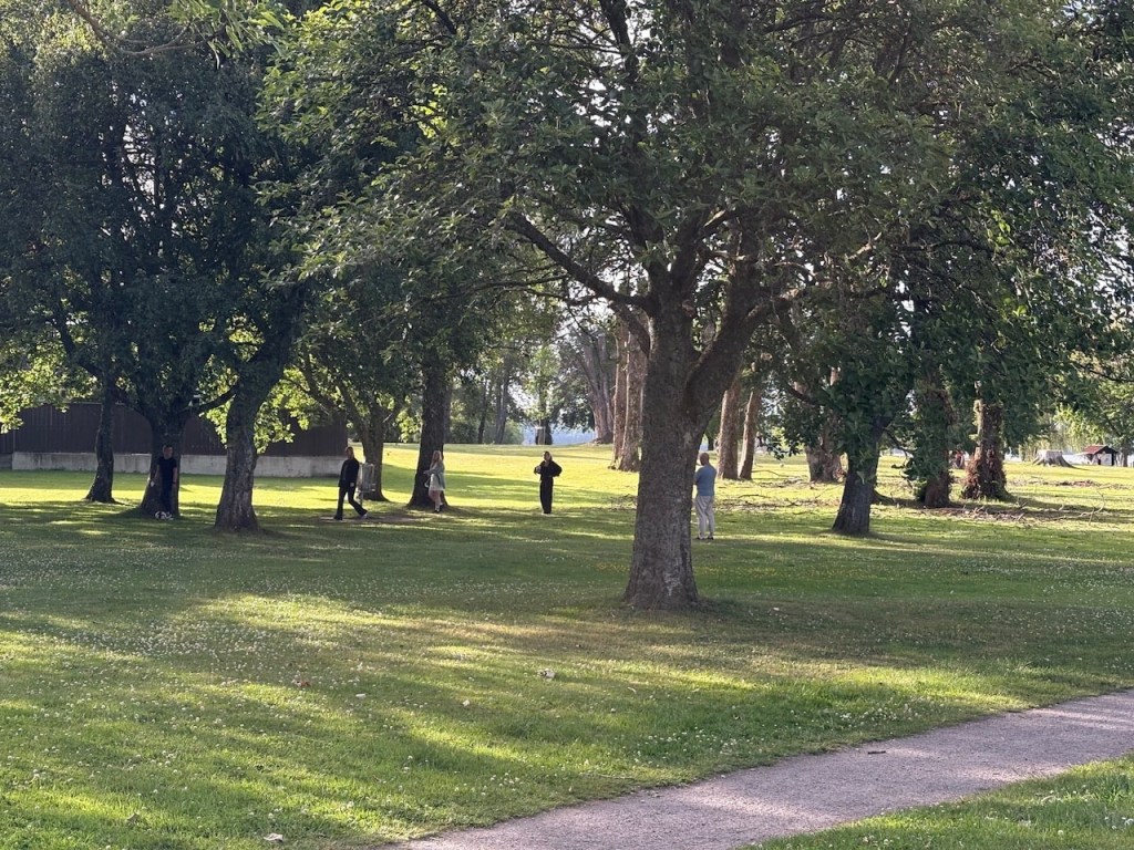 Dinner sitting outside, chasing the sun under the trees and watching people play frisby golf and football golf, walk their dogs and generally amble around.