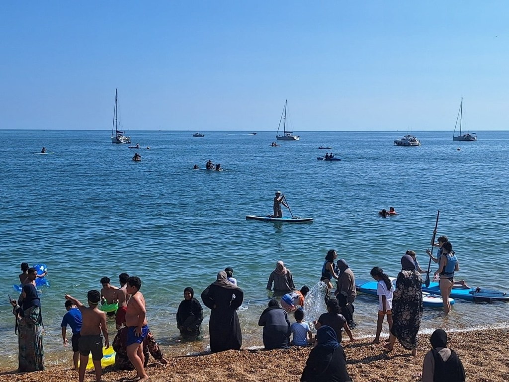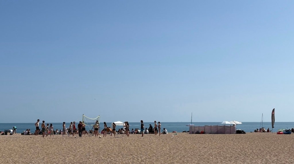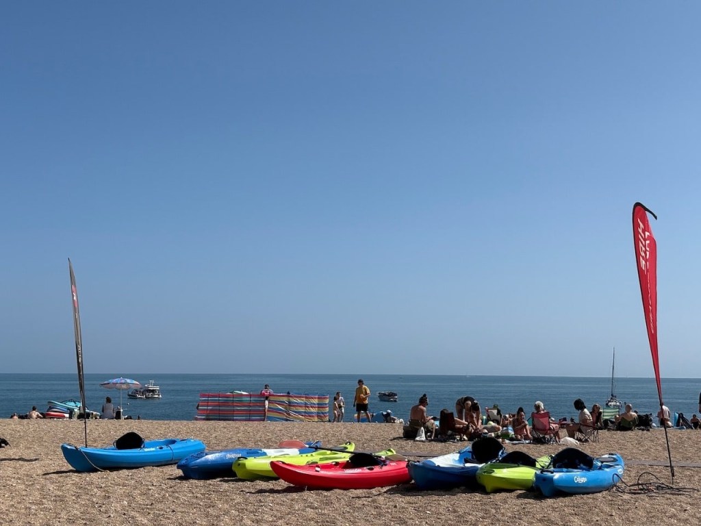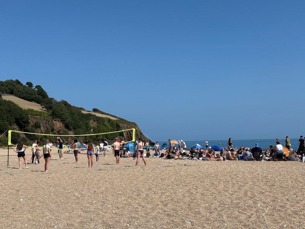 It’s Sunday and the sun is shining so the beach is packed. The sand is actually very small stones but that doesn’t seem to be stopping anyone enjoying a day out.