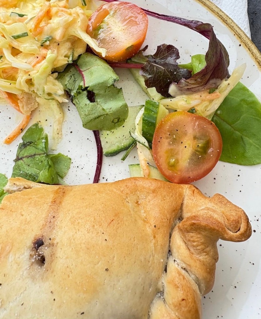 By now it’s spitting but still warm outside so we share a Cornish pasty and scone with a cuppa sitting under an umbrella outside the cafe.
