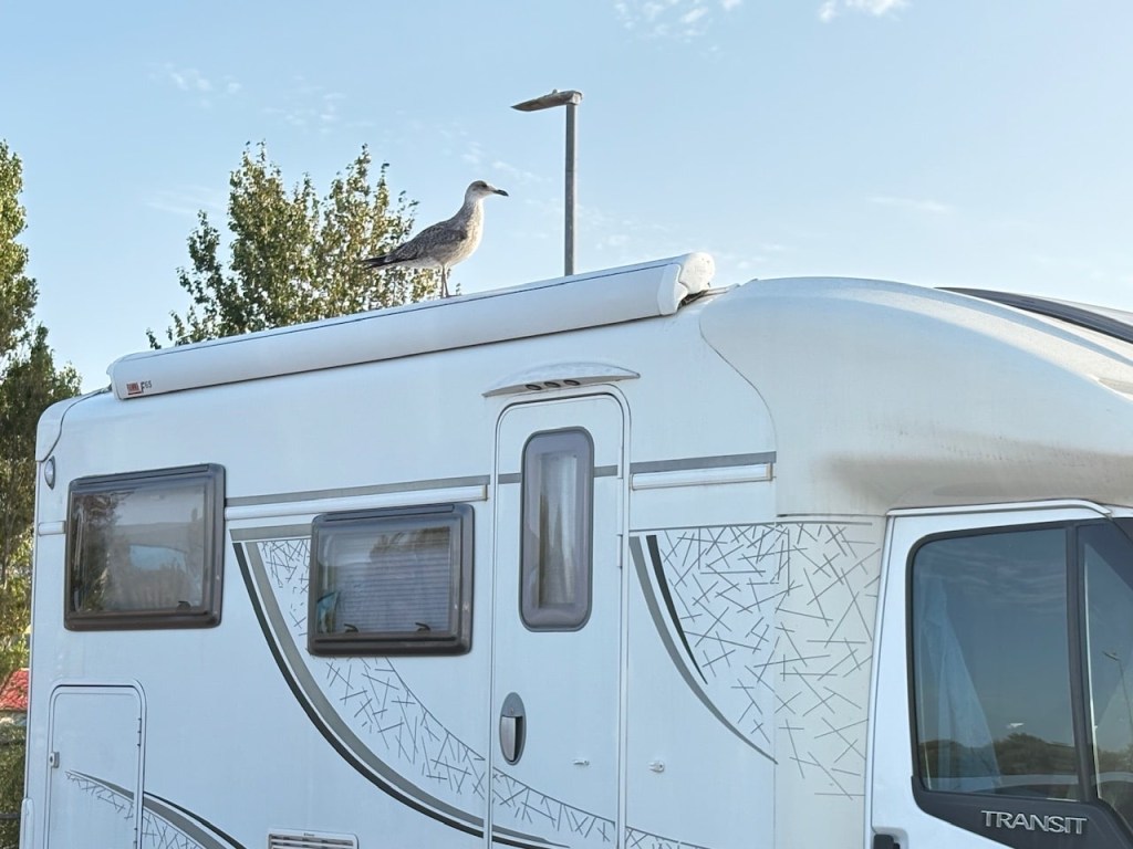 Lunch overlooking the sea and the beach followed by some down time. I hide in our warm van with all the windows open but some of the blinds down to keep the sun out trying to catch a breeze. T sits outside getting sweaty.