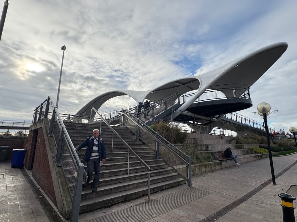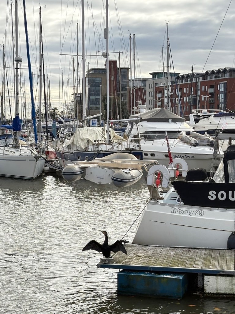 On towards the River Humber and estuary we cross over the Princes Quay footbridge to the marina. A cormorant is drying its wings putting on a show. The tide is out as we walk along the prom.